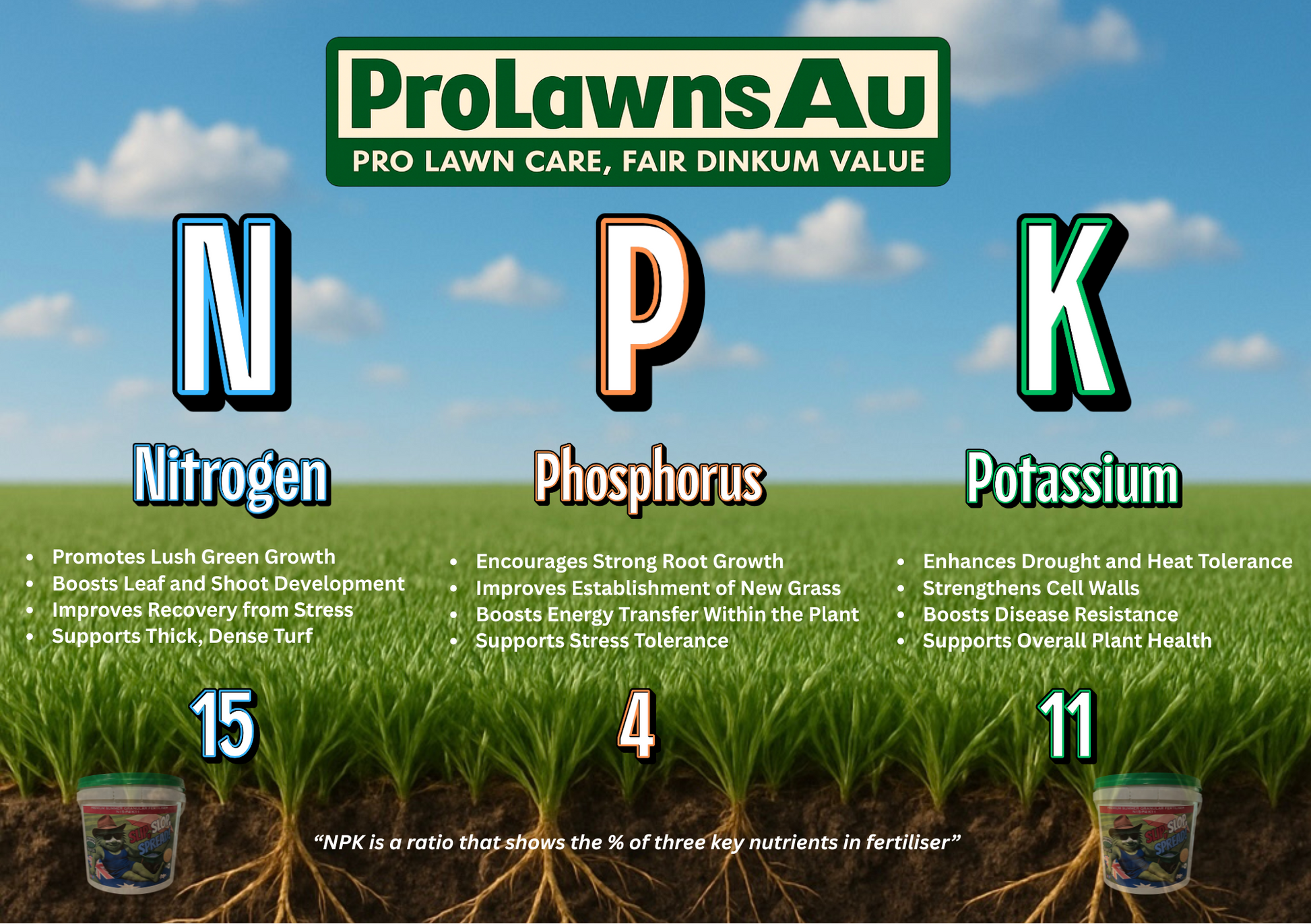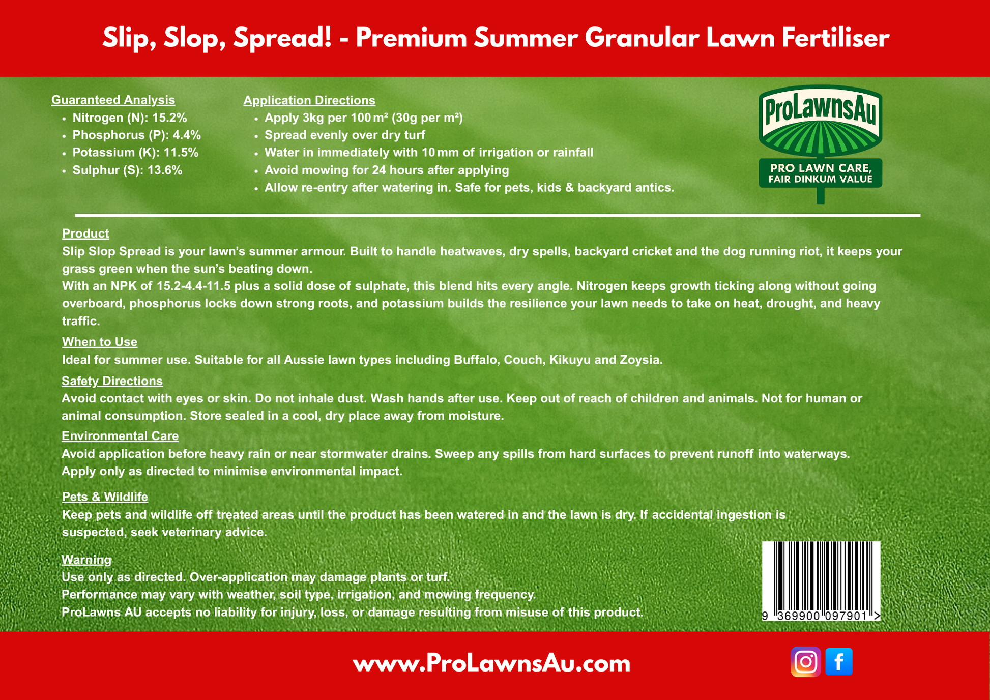 Your lawn’s summer armour. With a balanced NPK of 15-4-11, it fuels steady growth without overdoing it, builds heat resistance, and keeps colour locked in even when the backyard’s copping cricket, BBQs, and the odd burnout from the dog. It’s sunscreen for your turf, keeping it cool under pressure and green through the scorchers.